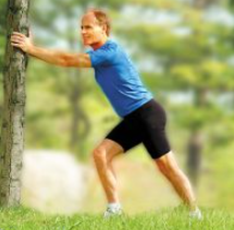 Stretch your arms in front of you and place both hands on a sturdy object. Stand with feet comfortably apart with toes pointing towards the wall. Put one leg back about 12 inches from the other, keeping the knee straight and your foot flat on the ground. Bend the knee of the front leg so your hips move forward and lean into your hands. You should feel this stretch along the back of the leg below the knee.
