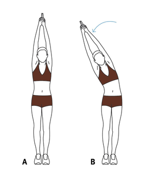 - Breathe out as you bend your upper body to the right. Take five slow breaths. Slowly return to the centre.