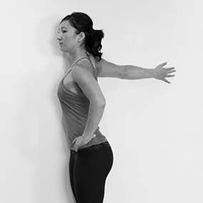 1. Stand with your arm extended to the rear and parallel to the ground. (Or for a variation, bend your elbow to 90 degrees.)